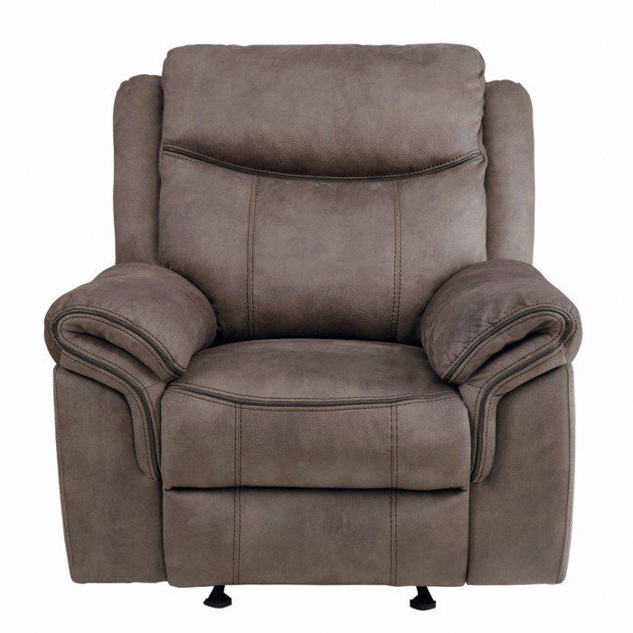 With amply appointed offerings that create not only a comfortable seating experience but a functional one as well, the Aram Collection will be a welcome addition to your home. The seating group is offered in a brown fabric or dark brown AireHyde for comfort and style that will blend effortlessly with your transitional decorative preference. Manual motion mechanisms operate with the pull of a side-mounted tab, that once engaged, take you from seated to reclined in an easy motion. The reclining chair features a glider mechanism that allows for easy back and forth motion.