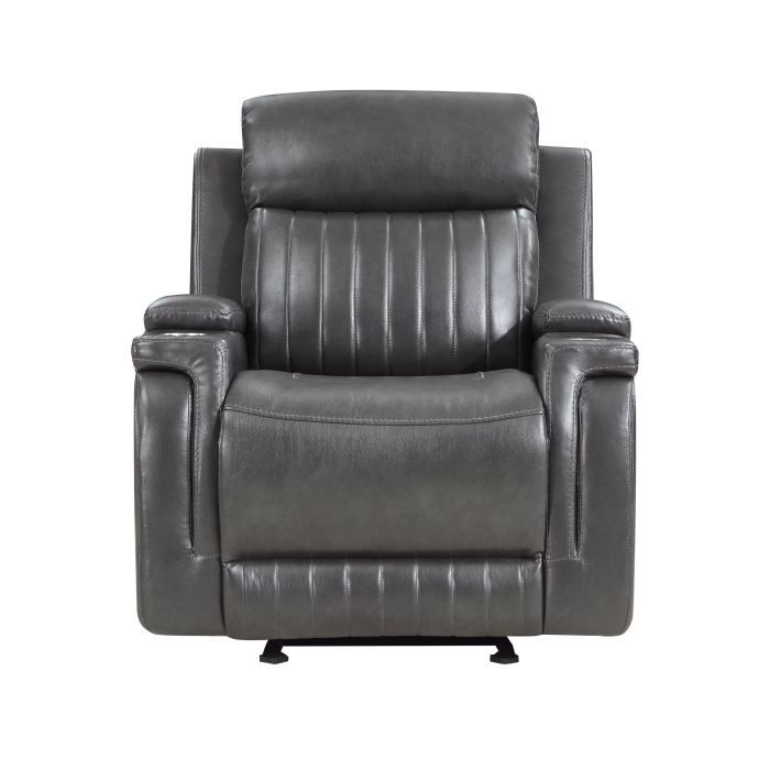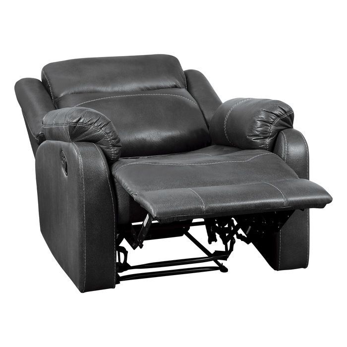 With well-appointed features that create not only a comfortable seating experience but a functional one as well, the Briscoe Collection will be a welcome addition to your home. The gray premium faux leather covering creates a style that will blend effortlessly with your transitional decorative preference. The glider reclining chair has a manual motion mechanism that is operated with the pull of a side-mounted tab, that once engaged, takes you from seated to reclined in an easy motion.
