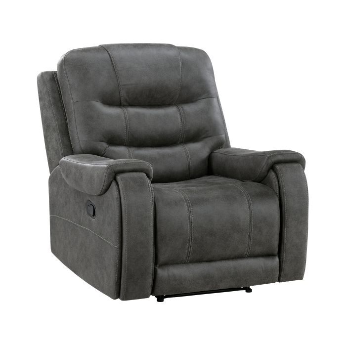 With a versatile style that is perfect for your casual living room, the Muirfield Collection’s plush seating and modern aesthetic create a platform for your relaxation. The plush pillow-top arms and seating of the chair are covered in gray textured microfiber upholstery for neutral accent to your home’s decor. Manual reclining mechanisms operate with the pull of a side-mounted tab, that once engaged, take you from seated to reclined in an easy motion.