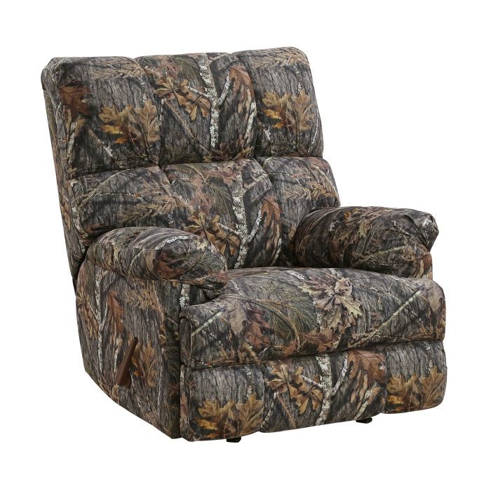 Bring rugged comfort and style to your space with the gliding recliner. Upholstered in durable, textured microfiber featuring the iconic camouflage pattern, this recliner is perfect for the outdoor enthusiast or anyone seeking a touch of nature-inspired décor. Sink into supportive comfort thanks to the high-density foam padding over individually wrapped pocket coils, while the gentle gliding motion provides soothing relaxation. Effortlessly recline to your preferred position with the convenient pull-handle mechanism. Built with a robust solid wood and plywood frame featuring a metal-reinforced seat to support up to 300lbs, this recliner is designed for lasting durability and comfort. The attached back and seat cushions maintain a clean and inviting look, making this gliding recliner the ultimate spot to unwind after a long day.