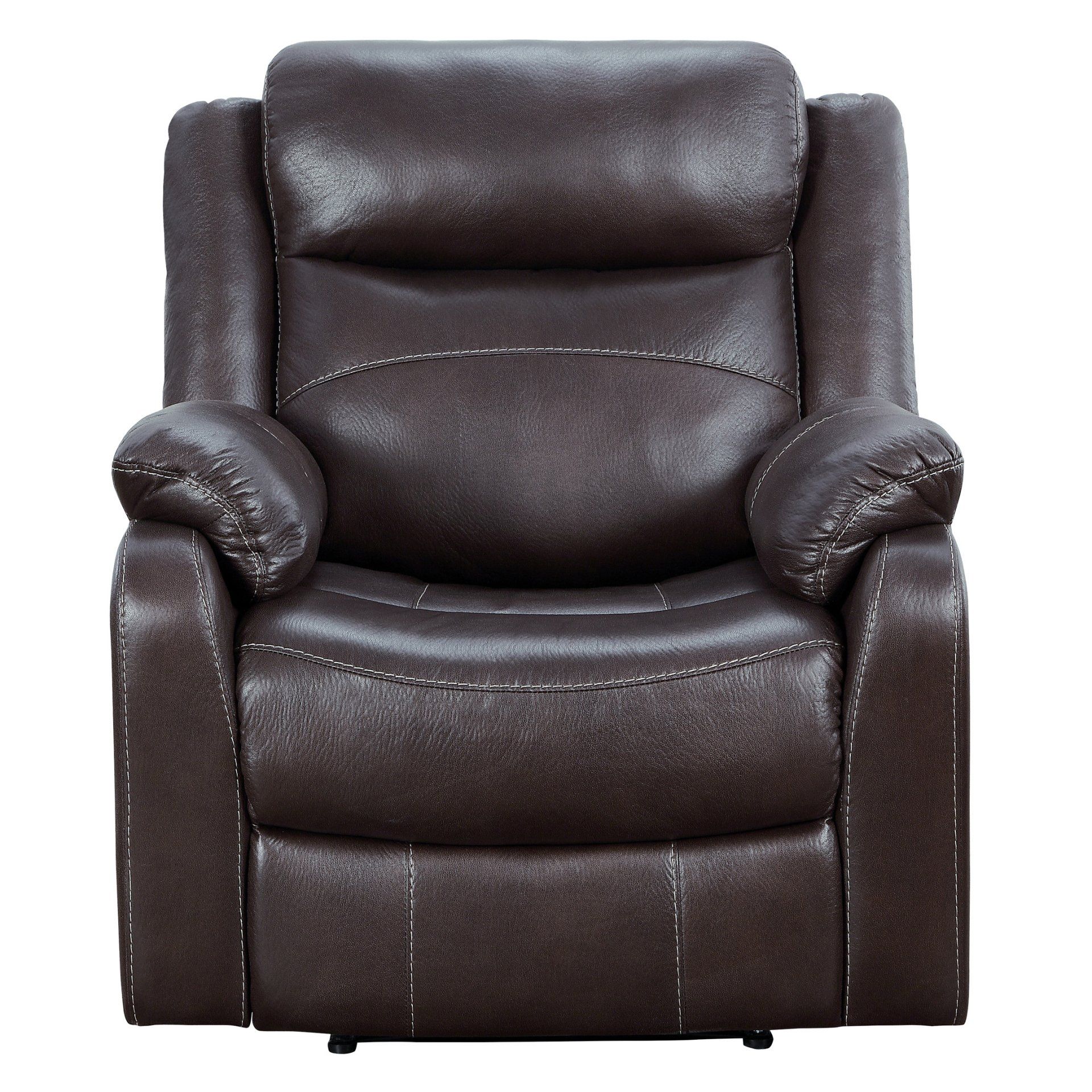 With well-appointed features that create not only a comfortable seating experience but a functional one as well, the Briscoe Collection will be a welcome addition to your home. The brown premium faux leather covering creates a style that will blend effortlessly with your transitional decorative preference. The glider reclining chair has a manual motion mechanism that is operated with the pull of a side-mounted tab, that once engaged, takes you from seated to reclined in an easy motion.