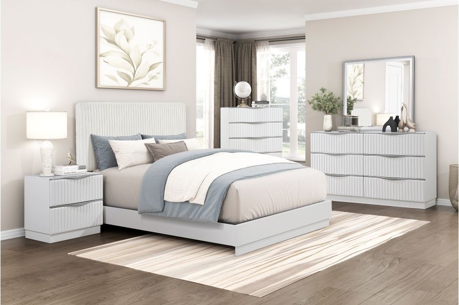 Revitalize your bedroom with our sleek, contemporary collection, featuring a crisp white finish and subtle texture from embossed panel drawer fronts. The centerpiece is a platform bed with footboard storage and an elegantly upholstered headboard that boasts integrated, next-generation COB, LED lighting for a natural, sleeker and more efficient glow . This highly functional collection includes a two-drawer nightstand with built-in USB-A and USB-C charging ports, a spacious six-drawer dresser with jewelry trays, and a five-drawer chest, all built with durable dovetail drawers and smooth ball-bearing glides. Complete the sophisticated look with an illuminated mirror that provides a flattering glow and enhances the modern aesthetic of your sanctuary.
