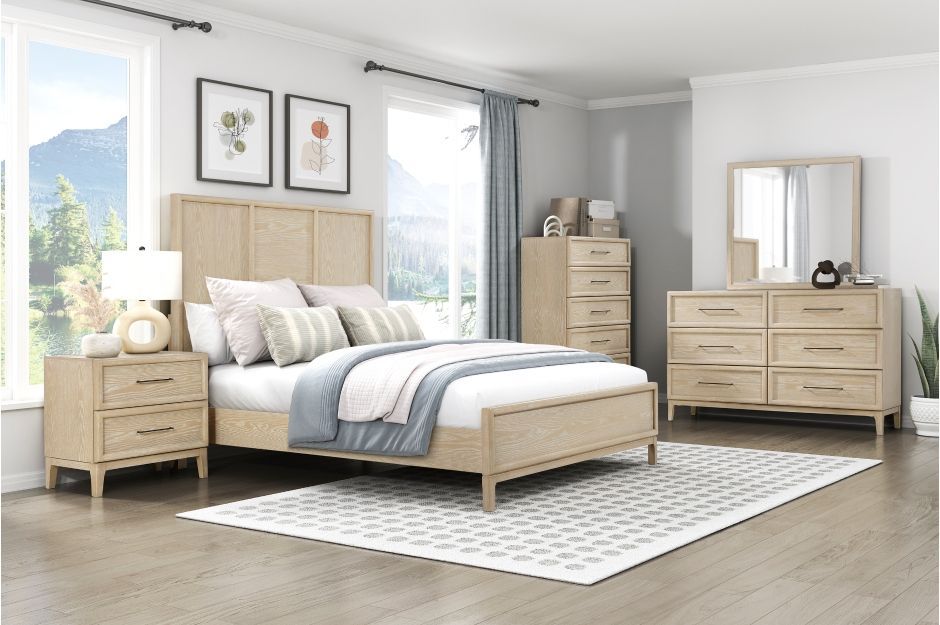 Introduce a serene, organic aesthetic to your sleeping space with this beautiful bedroom collection, finished in a soothing light brown oak veneer. The centerpiece is an elegant panel bed (available in queen, eastern king, or california king), featuring a distinctive three-panel headboard that highlights the natural wood grain. Complementing the bed are matching case goods—including the nightstand, 6-drawer dresser, 5-drawer chest, and square dresser mirror—all crafted with durable oak veneer. The case goods are built for longevity, featuring sturdy dovetail drawers that operate on ball-bearing glides and are accented with sleek black nickel-tone bar pulls, creating a calm, sophisticated, and highly functional sanctuary.