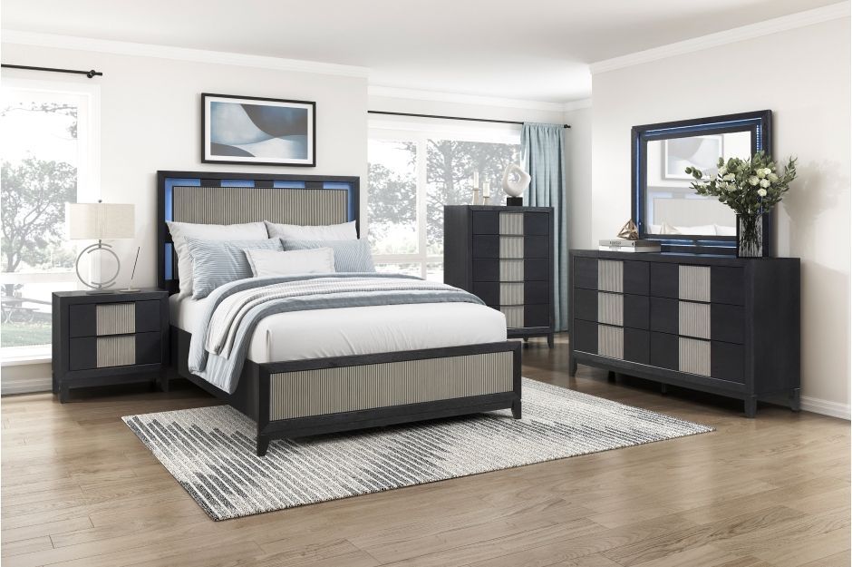 Craft a sleek, modern sanctuary with this stunning two-tone bedroom collection, featuring charcoal and gray finishes on durable wood veneer. The headboard and mirror include integrated LED lighting to set the perfect mood. Every piece boasts superior functionality with high-quality dovetail drawers gliding smoothly on ball-bearing glides. Finished with sleek black-tone edge pulls, this minimalist design instantly upgrades your bedroom decor.