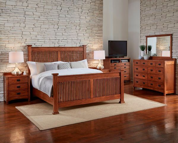 Expertly built from solid mindi wood, this bedroom set showcases a rich medium wood tone and oil-rubbed bronze hardware, offering lasting quality and classic appeal.