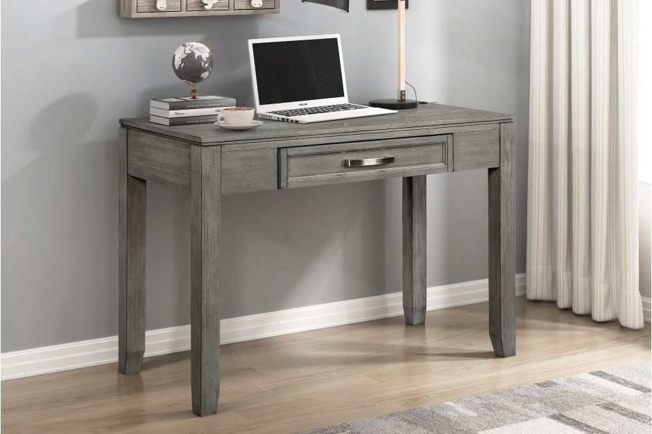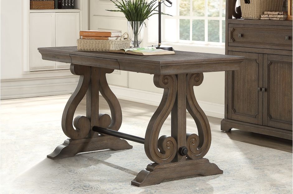 The solid transitional styling of the Cardano Collection creates an impactful design presence in your home. Utilizing distinct accent techniques – plank effect, rasping, saw marks – and pairing them with traditional framing and a rich finish – driftwood charcoal over acacia veneers – creates a bookcase that is worthy of your home. Pewter-finished hardware, mounted on the functional doors, provides a subtle contrast to the wood’s dark finish. Executive desk and writing desk are also available.