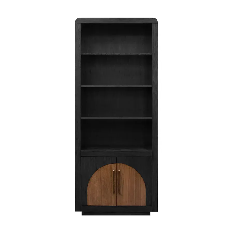 Bring Home the Eclipse 78 inch high Bookcase Pier for sophisticated reimagined vintage style. Beautifully crafted from Oak Solids and Veneers and Walnut Veneers, this Bookshelf Cabinet rests atop a crisp plinth base and features striking two-tone finish inlay arch panels on the doors that mirror the curves of the top corners. Showcase home decor and your book collection on open shelving above while concealing clutter behind two doors below. Pair with the matching TV Stand or Fireplace TV Stand to create a complete Entertainment Wall or display in multiples of two or three to form a chic bookshelf wall. Fully assembled upon arrival, this piece is ready to unbox and enjoy.