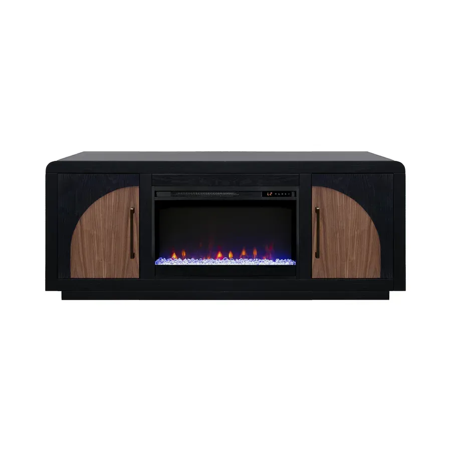 Bring Home the Eclipse 65 inch Fireplace TV Stand for sophisticated reimagined vintage style. Beautifully crafted from Oak Solids and Veneers and Walnut Veneers, this Entertainment Center with Fireplace rests atop a crisp plinth base and features striking two-tone finish inlay arch panels on the doors that mirror the curves of the top corners. Each door includes Antique Bronze Hardware and conceals interior shelving for media and gaming consoles. Designed to accommodate TVs up to 75 inches, this Fireplace TV Console also includes cable management openings on the back panel. The 26” Electric Fireplace Insert includes a remote control and multiple settings allow for heat up to 400 square feet. Four (included) screws make securing the fireplace insert to the console quick and simple. Pair with the matching Bookcase Pier Cabinet to create a complete Entertainment Wall.