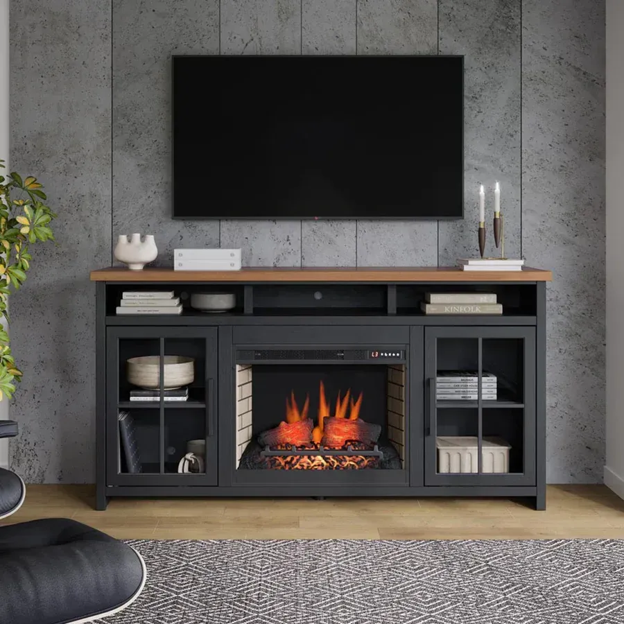 The Essex 74" Fireplace TV Stand combines coastal cottage charm with a modern farmhouse flair, ideal for refreshing your living space. It supports TVs up to 85" and offers ample storage for all your media essentials. Finished in an eye-catching Black and Whiskey, this stand includes a 28" fireplace insert that heats up to 400 square feet, featuring traditional log set options.