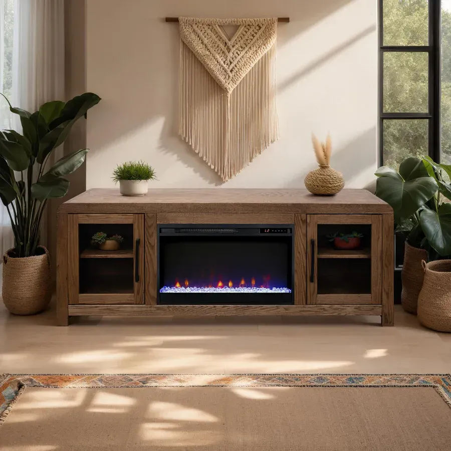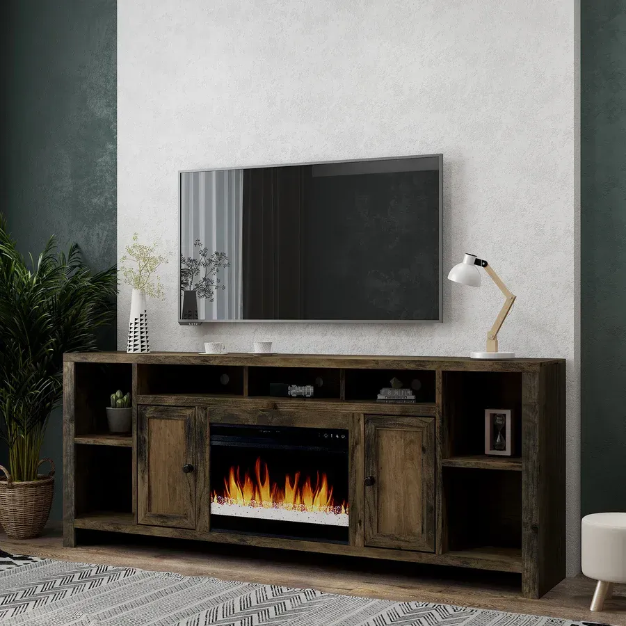 The Joshua Creek 84" Fireplace TV Stand combines rustic charm with modern design, featuring a barnwood finish and sleek lines. It supports TVs up to 95" and includes a soundbar shelf and open shelving. The integrated 26" fireplace insert offers 4 flame color options and 7 heat settings, enhancing your viewing experience with warmth and ambiance.