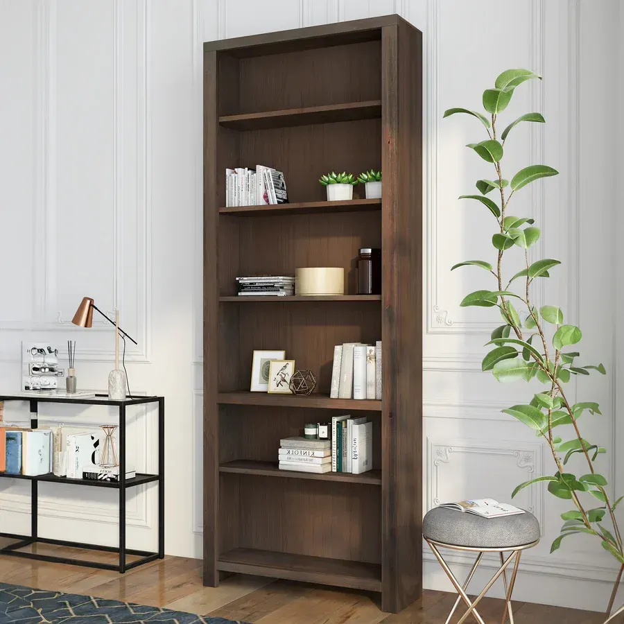 The Laurel Canyon 80 inch high Bookcase delivers the perfect blend of modern, urban style with rustic tranquility. Skillfully crafted from Oak Solids and Veneers, this robust Bookshelf is available in your choice of three finish options. The unique, six alternating shelves will provide ample space to showcase home décor, house your book collection or organize office supplies. From mountain lodge to urban loft, the clean lines of Laurel Canyon will be a stunning and welcome addition to living room, home office or bedroom. Fully assembled upon arrival, this piece is ready to unbox and enjoy.