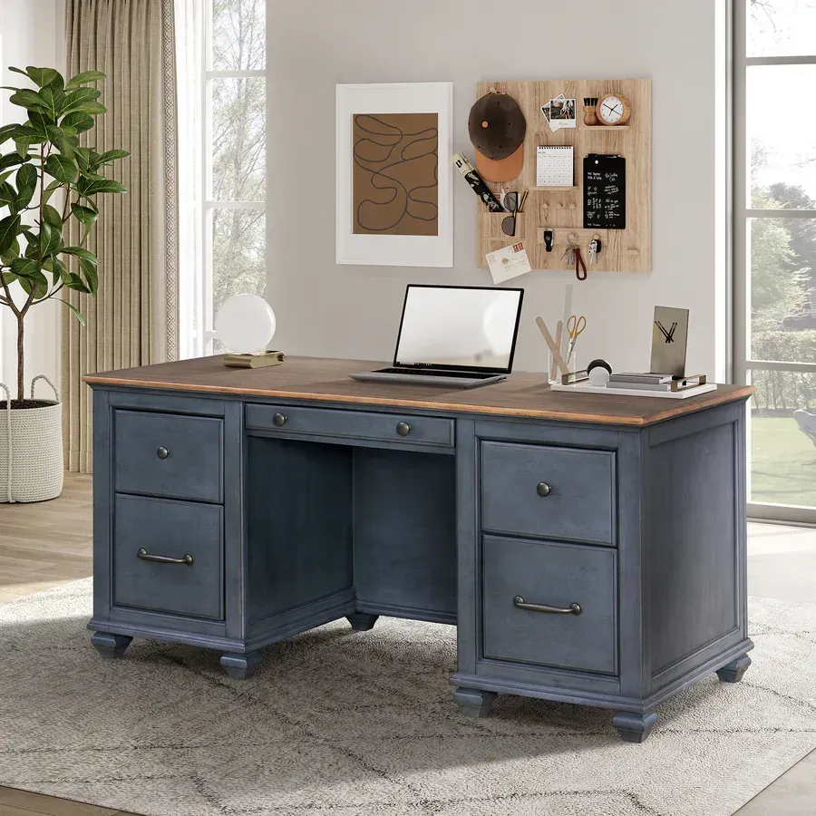 The Americana 66 inch Executive Desk boasts a refreshing coastal twist on traditional style. Skillfully crafted from Rubberwood Solids and Birch Veneers, the subtle distressing and Corduroy Blue finish give this Computer Desk an updated look with a timeless heirloom feel. Featuring a dropdown keyboard drawer, two storage drawers and two letter hanging file drawers, this Desk is the ideal spot to get your best work done. Just like Baseball, Apple Pie and Rock & Roll, the Americana Executive Desk will become a beloved favorite in your home. Fully Assembled upon arrival, this piece is ready to unbox and enjoy.