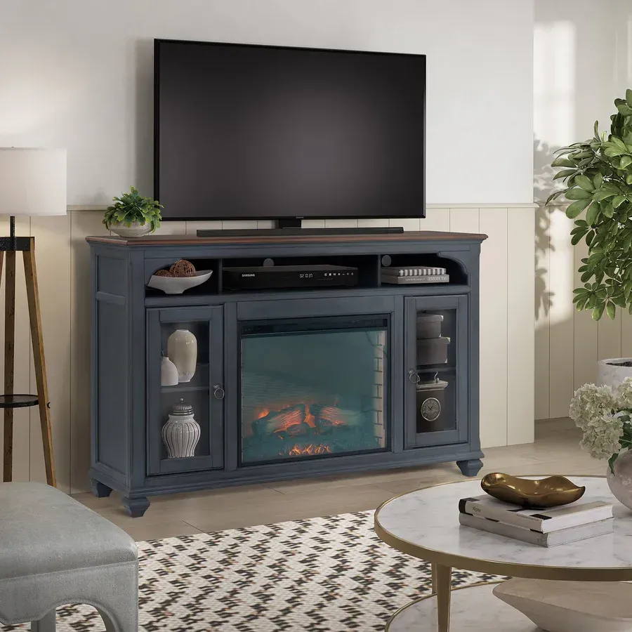 The Americana 66" Fireplace TV Stand combines classic charm with modern functionality. Its Corduroy Blue finish and gentle distressing evoke a coastal vibe, while the brushed hardware adds a touch of elegance. Perfect for cozy evenings, this piece brings the timeless appeal of the Americana Collection into your living space.