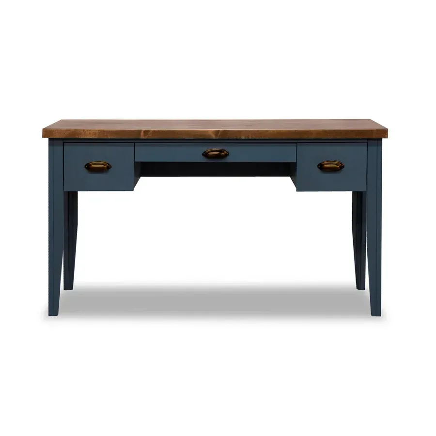 The Nantucket Writing Desk combines the charm of coastal cottage aesthetics with the simplicity of modern farmhouse design. This piece features a captivating Blue Denim and Whiskey finish complemented by oil-rubbed bronze hardware. It includes a drop-down keyboard drawer and ample storage drawers, making it a stylish and functional addition to any home office.