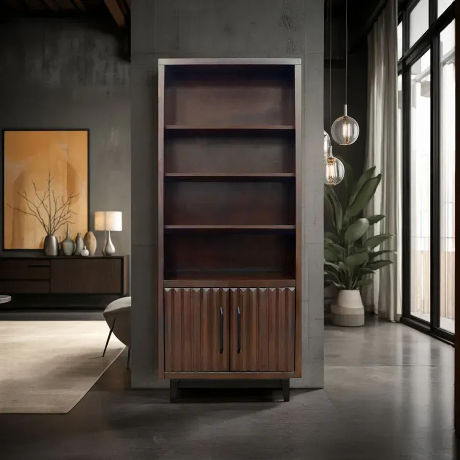 Sophisticated, modern style doesn't get better than the Radiance 78 inch high Bookcase Pier. Artfully crafted from Poplar Solids and Okume Veneers, this showstopping Bookshelf Cabinet is available in two rich finishes and includes Matte Black Hardware and a sleek wood base with tapered legs. Showcase home decor and your book collection on open shelving above while concealing clutter behind two stunning fluted doors below. Pair with the matching TV Stand or Fireplace TV Stand to create a complete Entertainment Wall or display in multiples of two or three to form a chic bookshelf wall. Fully Assembled upon arrival, this piece is ready to unbox and enjoy.