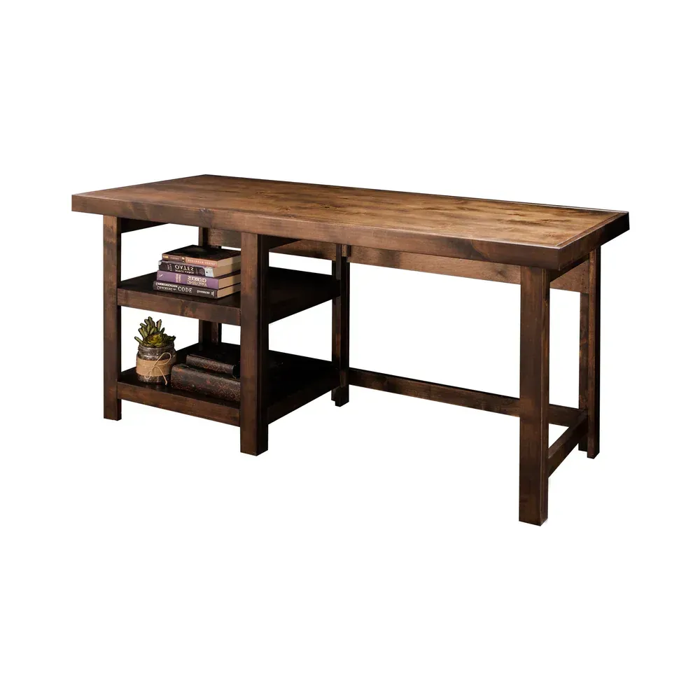 Blending the look of vintage industrial with modern design is the Factory Collection. Burnished rustic wood planks make up the desk top and features wrought iron style metal framing that supports both the top and the wooden display shelves. The continuous finished design makes this unit flexible for placement as a freestanding piece. Matching bookcase and occasional tables are also available.