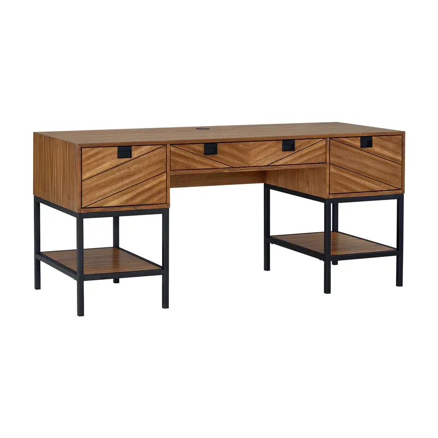 Bring home the Astoria 66 inch Executive Desk to furnish your home office in modern, contemporary style. Crafted from Acacia Solids and Veneers, this showstopping Computer Desk features a crisp chevron pattern in a Natural finish that beautifully showcases the unique characteristics of the wood grain with a Black Metal Base and Hardware. Featuring a three storage drawers and two shelves, this Desk is the ideal spot to get your best work done. The Astoria will make an upscale statement in your home.