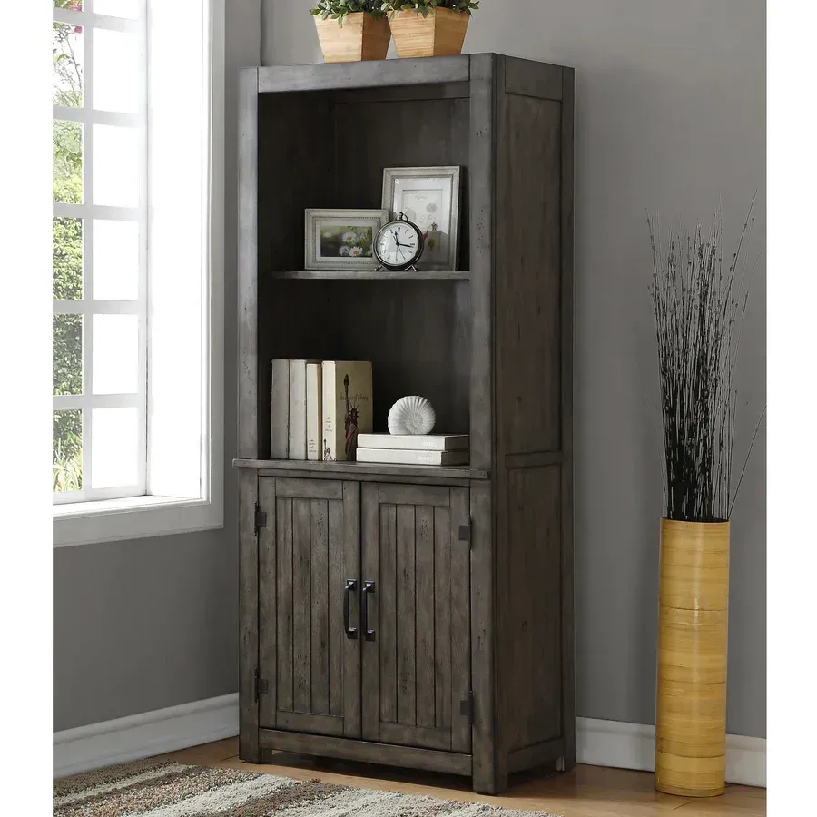 Evoking the spirit of the industrial revolution, the Storehouse Bookcase is a standout addition to any home office. It features open shelves and rustic slat panel doors, perfect for organizing books and office essentials. The smoked grey finish and forged iron accents enhance its unique, vintage appeal.