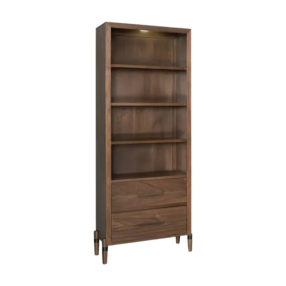 Make a refined statement in your living room or home office with the serene, sophisticated Tranquility 80 inch high Bookcase Pier. Crafted from Poplar Solids and Walnut Veneers in a warm Walnut Finish, this Bookcase features LED lighting, three shelves, two drawers, sleek, tapered Mid-Century Legs and Antique Bronze metal hardware. Whether flanking the matching Fireplace TV Stand or housing office supplies in your home office, this modern bookshelf cabinet boasts ample storage space and will make a stylish addition to your home.
