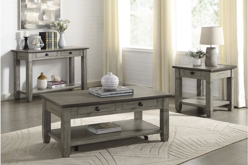 Inspired by the aesthetic of a casual country home and providing functional decorative accent for your living room is the occasional table set of the Granby Collection. The two-tone look of the acacia and pine solids base, finished in antique gray, and the oak veneer of the tables coffee-finished tops, present as a harmonious combination of color, perfect for your home.