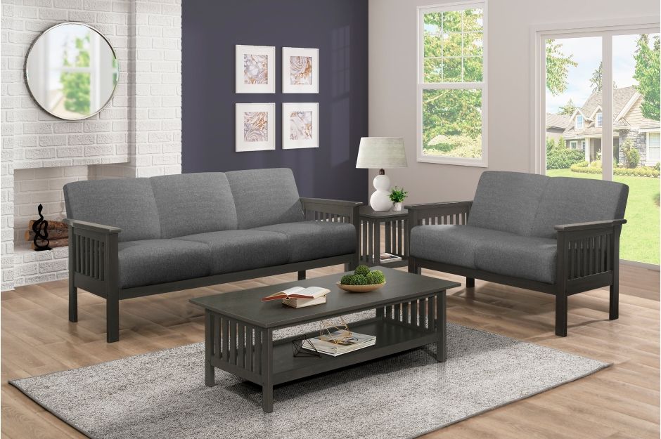 Designed with inspiration from the Arts & Crafts movement, the Lewiston Collection will be a classic addition to your home’s décor. The sofa, love seat and chair's transitionally styled legs and vertical slat-supported wood arms are finished in an antique gray, providing complementing contrast to the gray linen-like fabric covering.