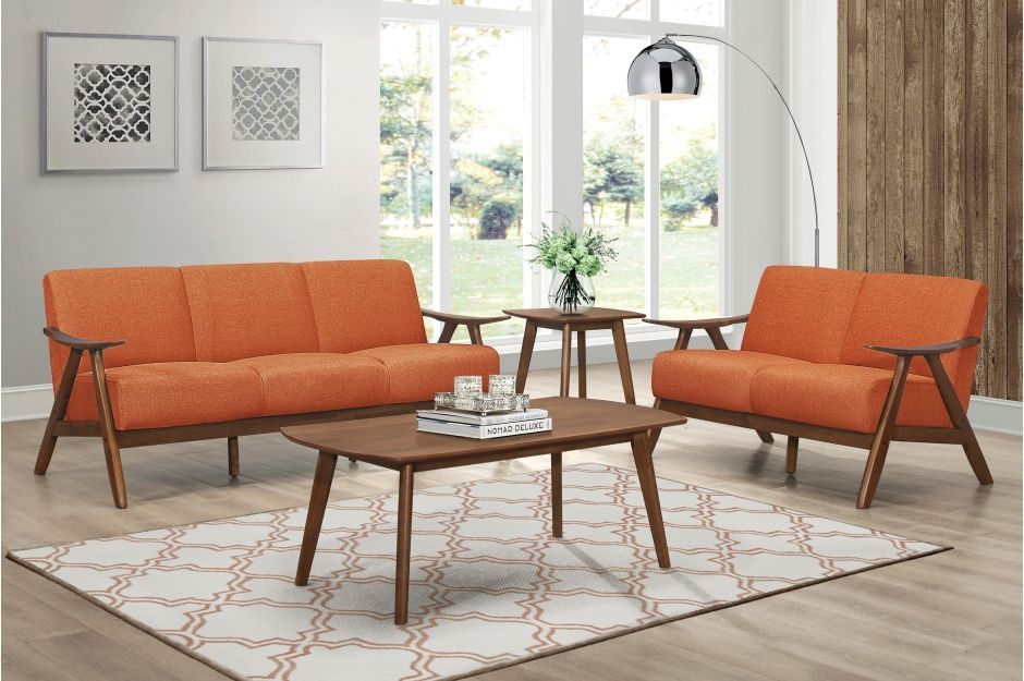 The retro-inspired wood framing of the Damala Collection will perfectly accent your modern home décor. Subtle contouring to the seating collection’s wood frame is finished in walnut, presenting as a classic complement to the orange fabric that covers the padded seats and backs of the sofa and loveseat.