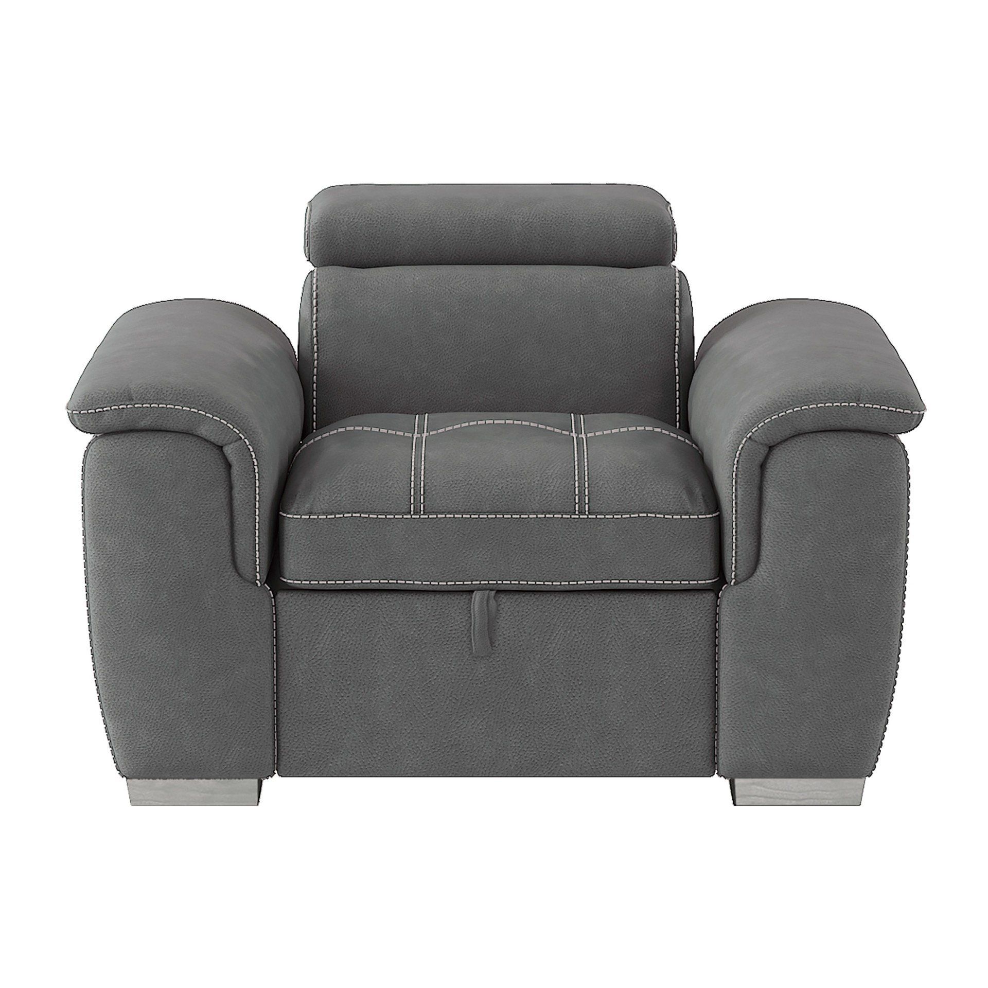 Turning your seating area into a platform for lounging is the versatile Driggs Collection. Click-motion mechanisms allow for the lounger back to go from upright to flat with little effort. The side arms are also adjustable, allowing for an even surface with the flat-adjusted back. The Driggs Collection is offered in gunmetal gray and silver-gray chenille, each a neutral canvas for your personal decorative preference.