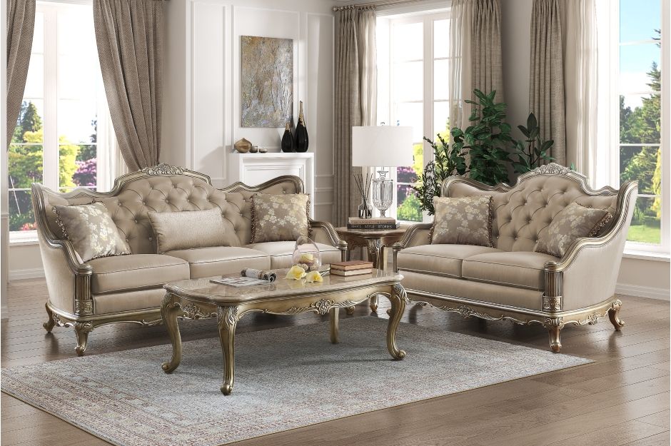 The elaborate designs of Old World Europe are treated with a distinct modern touch in the Florentina Collection. The eye-catching jewel tufting reflects with a brilliance intended to accentuate the dusky taupe coloring of the faux silk and the rich silver, with gold undertone finish of the show wood frame. With details such as shell and acanthus leaf scrolling, routed pilaster and cabriole legs, the traditional look of the collection is solidified. The accenting faux silk toss pillows feature traditional fringe detailing and a complementing detail pattern. The series 8412 Florentina Seating and Occasional Collections complement the Homelegance series 1867 Florentina Bedroom and Dining Collections.