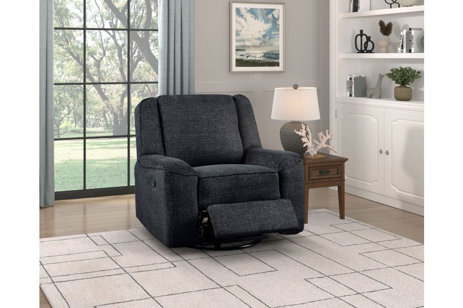Your comfort is at hand in the design of the Lyndon Collection. The dual reclining ends of the sofa and love seat, and the single mechanism of the glider reclining chair, are engaged with a pull of the side-mounted tab. The love seat features a center console, with cupholders and hidden storage providing functional accent to your seated experience. Gray chenille fabric upholstery covers the plush, subtle modern framing, furthering your comfort, and serving as a neutral palette for your living room décor.