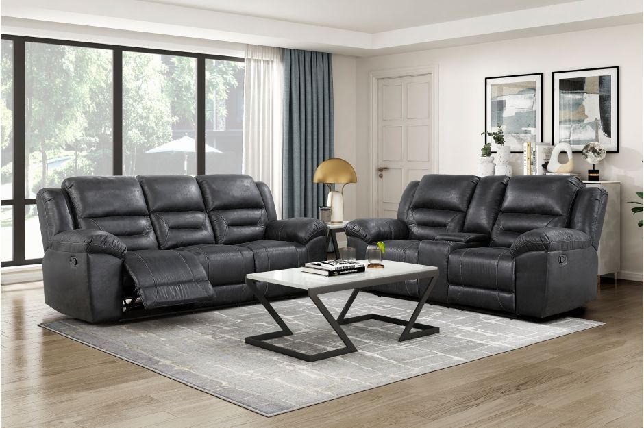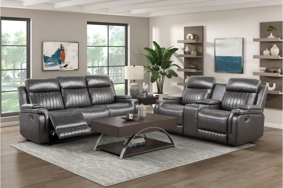 Plush seating, functional accessories and versatile styling blend effortlessly to create the look of the Aram Collection. The gray breathable faux leather upholstery covering will pair perfectly with your transitional decorative preference. The sofa features dual reclining ends, a drop-down center seat back with cup-holders and both electric and USB receptacles, and a hidden storage drawer located below the center seat. The dual glider reclining ends of the love seat flank the center console which features cupholders, as well as electric and USB receptacles that are located within the storage compartment. A glider reclining chair is also available. The manual motion reclining mechanisms of each piece in the collection operate with the pull of a side-mounted tab, that once engaged, take you from seated to reclined in an easy motion.