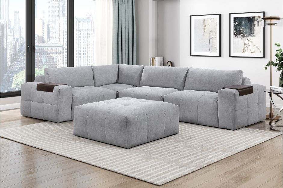 Enhance your living space with this stylish and adaptable gray sectional sofa. Upholstered in durable textured fabric, the cushions feature a feather blend topper over high-density foam for plush support. For convenience, the sofa includes a wooden arm tray, and the ottoman with casters allows for easy setup configuration. With reversible cushions and a family-friendly design, this sectional is built for comfort and longevity.