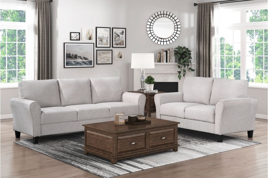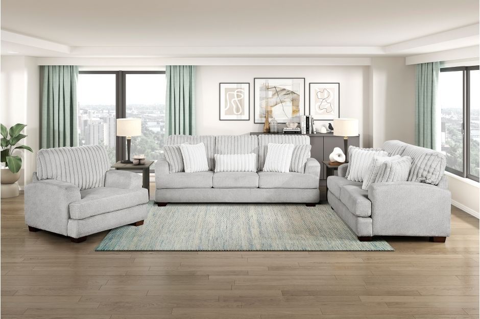 Add a touch of elegance and ample seating to your living space with this Broadway Collection, designed to blend style and comfort effortlessly. Upholstered in soft, silver cloud fabric, this seating features a sleek, modern look with clean lines and tapered wood legs that complement contemporary, mid-century, and transitional decor. Ideal for family rooms, apartments, or open spaces, this seating provides a spacious seating arrangement perfect for lounging, entertaining, or everyday relaxation.