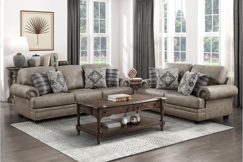 With a refined look that is steeped in traditional design, the Franklin Collection provides a timeless elegance to your living room. Mushroom-hued polished microfiber covers the frame of the collection while traditional rolled arms, and nailhead trim provide classic detail to profile of the seating group. Contrasting toss pillows solidify the look, the floral and plaid designs an elegant pairing to complement your space.