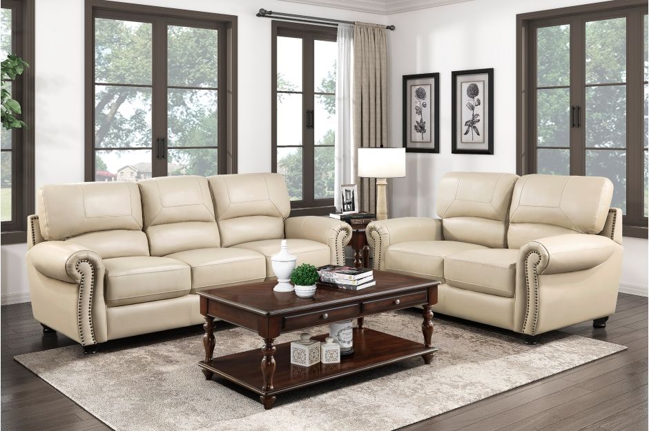 Traditional design and classic accents are paired to create the timeless look of the Foxborough Collection. Cream-hued top-grain leather covers the plush seating of the sofa, love seat, and chair everywhere the hand touches – with faux leather match covering the remaining areas. The profile of the seating arrangement is defined by elegantly rolled arms, plush seatbacks, and nailhead trim.