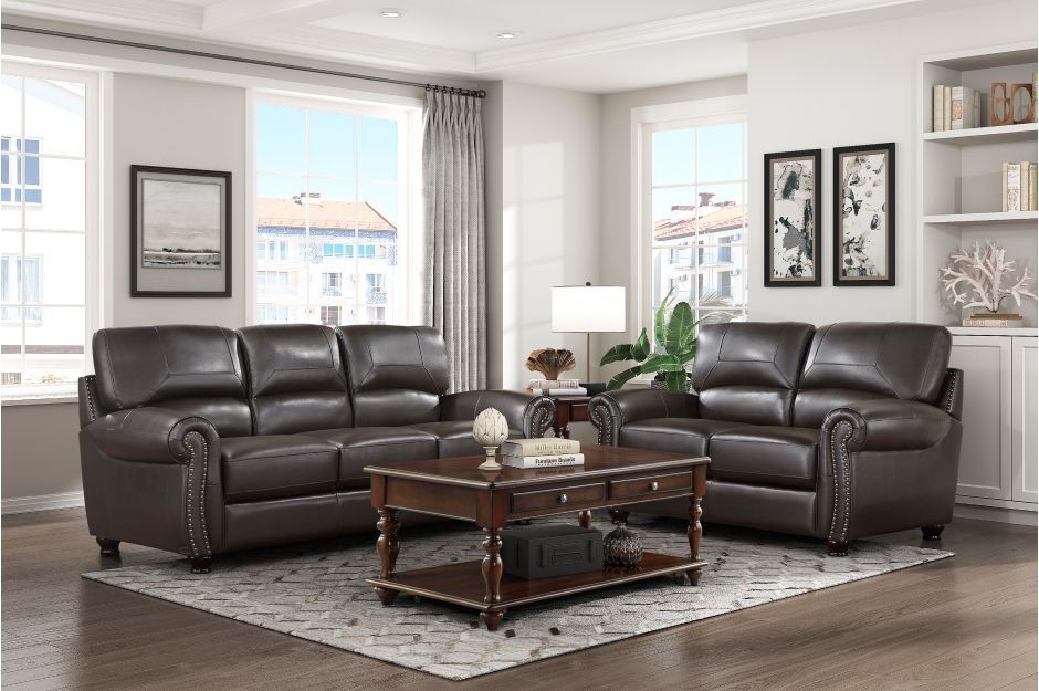 Traditional design and classic accents are paired to create the timeless look of the Foxborough Collection. Dark brown top-grain leather covers the plush seating of the sofa, love seat, and chair everywhere the hand touches – with faux leather match covering the remaining areas. The profile of the seating arrangement is defined by elegantly rolled arms, plush seatbacks, and nailhead trim.