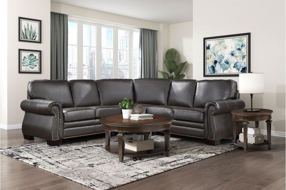 The plush seating of the Exton Collection sectional provides ample space for your family and friends to gather in enveloping comfort. The sectional features a gray top-grain leather cover – with faux leather match – furthering the comfort of your seated experience. The collection is comprised of a right-side chaise and left-side two-seater. The transitional design of the collection pairs perfectly with your home’s casual living space.