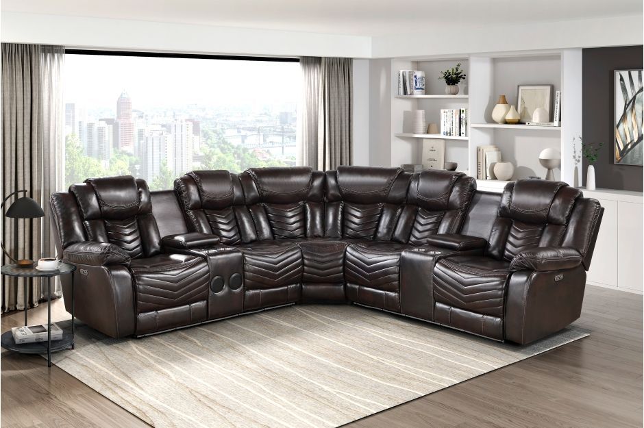 Transform your entertainment space with this 3-piece power reclining sectional, designed for ultimate comfort, technology, and cinematic luxury. Featuring power reclining seats, built-in Bluetooth speakers and subwoofer, and vibrant LED lighting, this sectional delivers an immersive home theater experience like no other. The spacious seating is upholstered in premium faux leather, offering a sleek and durable design that complements any modern living space. Integrated center consoles with cup holders and storage compartments keep essentials within reach, while deeply cushioned seats and plush armrests provide superior comfort for hours of relaxation. Built with a sturdy metal seat frame and smooth reclining mechanism, this sectional ensures long-lasting durability and seamless operation, making it the perfect choice for family rooms, media rooms, or dedicated home theaters.