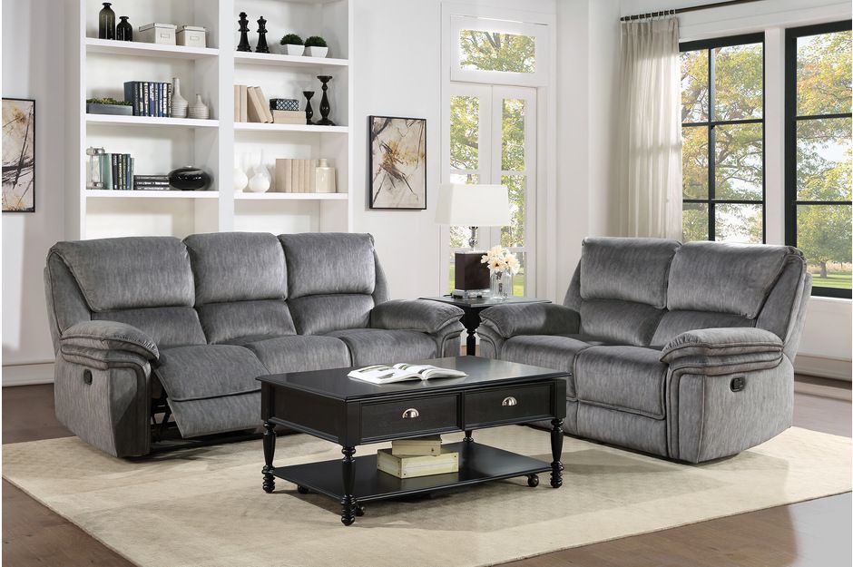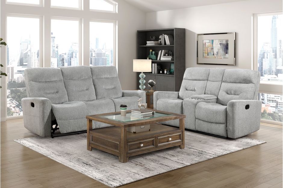 Convenience and comfort provide the basis of the design of the Dean Collection while the unfettered lines of modern design lend a casual air to the seating group’s profile. The sofa and love seat feature dual reclining ends with the love seat featuring a console with cup holders and hidden storage space while the reclining chair allows for solo seating within your space. Manual motion mechanisms allow for your reclined experience and are engaged with a pull of the side mounted tab. Gray polished microfiber presents as a neutral palette for your home’s subtle modern style.