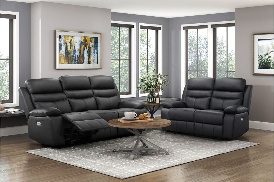 The Hancock Collection’s versatile look, paired with the feel of top grain leather and power reclining, will help to create a welcoming and comfortable space within your home. The dual reclining ends of the sofa and love seat, as well as the reclining chair, are engaged with a touch to the side mounted power controls. The subtle modern frame of the sofa, love seat, and chair is covered in 100 percent top grain leather where the body touches, with faux leather covering the remaining areas, its black hue complementing your home’s décor.