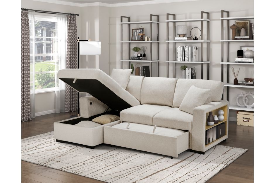 Providing a casual look and plentiful functionality to your living room is the Pompano Collection. The pull-out bed that is stored beneath the right-side two-seat unit, pops up to create ample space for full leg extension while the lift-top seat of the left-side chaise opens to reveal hidden storage perfect for blankets and pillows. Additional functionality comes in the form of the side mounted shelving units located within the outer face of the side arms and the USB charging ports, allowing you to keep your device close during your time of relaxation. Coordinating seating is provided by the swivel armchair, it’s 360-degree turning radius allowing you to interact with your family and friends. The collection is covered in beige boucle fabric, it’s neutral tone and satisfying texture a subtle complement to your home’s décor.