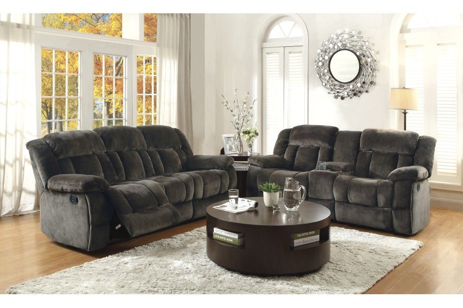 The Yates Collection pairs subtle modern lines with classic comfort, creating a seating group perfect for your casual living room. The dual ends of the sofa and love seat, and single reclining of the chair, are engaged with a pull of the side mounted tab, taking your seated experience to the next level of comfort. Dark brownish-gray textured microfiber covers the collection lending soft touch and decorative versatility. The love seat features a console with dual cupholders and hidden storage.