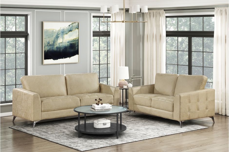 Elegant modern styling is achieved in the design of the Cazon Collection making its addition to your living room a perfect complement to your home’s decor. The lines of the sofa, love seat, and chair’s profiles create definition in their simplicity - from the seat cushions to the polished silver finish of the support legs. The collection is covered in polished microfiber in one of two neutral hues – brownish gray or sand.