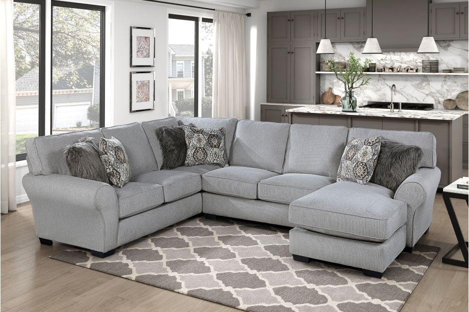 The transitional profile of the Kieran Collection is paired with a hint of modern flair to create a unique addition to your home’s living room. Gray chenille upholstery covers the sectional with both neutral patterned fabric, and graphite-hued faux fur accent toss pillows, adding a touch of whimsy. The corner sofa segment pairs with a three-seat sofa chaise to create the ample seating arrangement of the Kieran Collection.