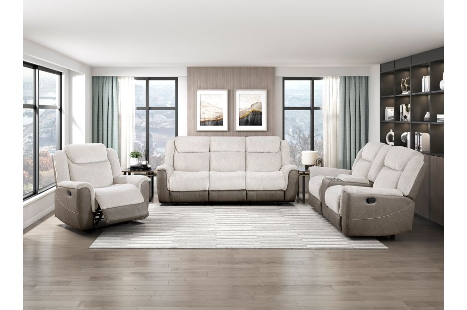 Discover unparalleled comfort and style with our dual-fabric reclining collection. Featuring plush chenille seating surfaces contrasted with durable microfiber, each piece offers a unique touch of modern elegance. Sink into supportive foam over pocket coils and recline effortlessly with a convenient tab pull. Built with sturdy frames and metal-reinforced seats (supporting up to 300lbs per seat), this collection ensures lasting quality. The loveseat includes a practical center console with cupholders, while the recliner and sofa offer spacious individual comfort. Elevate your relaxation experience with this exceptional collection.