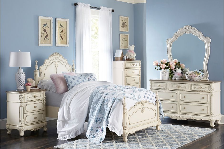 The Cinderella Collection is your little child’s dream come true. The Victorian styling incorporates floral motif hardware and traditional carving details on the white with gray rub-through finished TV armoire that will create the feeling of stepping into a fairy tale. Chest, mirror, nightstand, dresser, lingerie chest, desk, hutch, desk chair, daybed, twin canopy poster bed, twin trundle, full canopy poster bed, twin bed, full bed and queen bed are also available.
